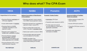 CPA امتحان کا عمل اسٹیٹ بورڈز آف اکاؤنٹنسی، امریکن انسٹی ٹیوٹ آف سرٹیفائیڈ پبلک اکاؤنٹنٹس ، نیشنل ایسوسی ایشن آف اسٹیٹ بورڈز آف اکاؤنٹنسی اور پرومیٹرک کے درمیان شراکت داری ہے۔ مزید تفصیلات کے لیے یہ چارٹ دیکھیں۔